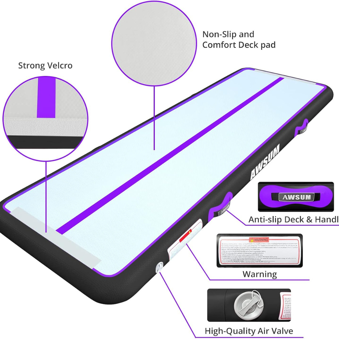 This set includes a 10ft x 3.3ft x 4in mat in purple/black and an air roller with a diameter of 23.6in (length 39.4in) in purple. Its design emphasizes ease of transport and operation, though some users have expressed wishes for better air retention, a higher quality pump, and improved carrying bag options for even greater convenience.