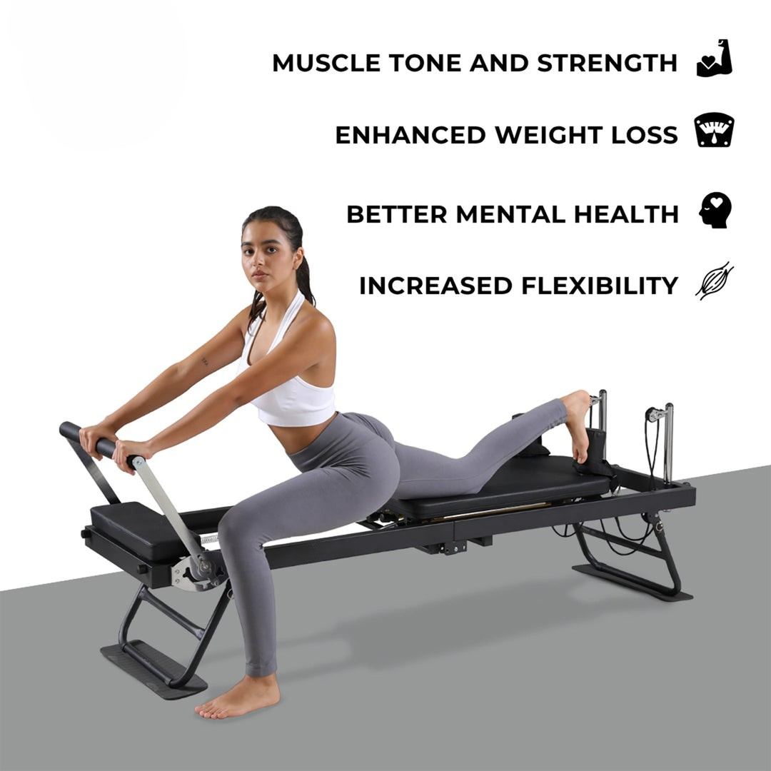Perfect for home use, this reformer gives you the full studio workout experience without taking up extra room. When youâre done, simply fold it in half for quick, compact storage. Built to be durable and space-saving, it delivers all the benefits of a professional reformer without the bulk.